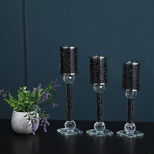 Ambrose 3 Candles Holder Set, Black Crushed Diamonds Glass