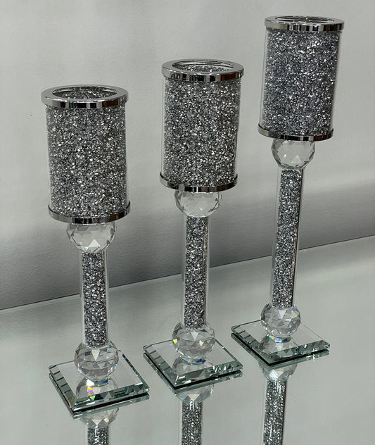 Ambrose 3 Candles Holder Set, Silver Crushed Diamonds Glass
